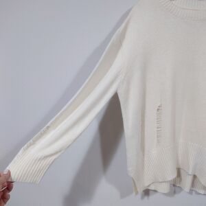 Cream / off-white oversized sweater with intentional distressed details. Soft wool blend knit with side slits and an asymmetrical hemline, slightly longer in the back. Relaxed fit with dropped shoulders, perfect for layering and effortless styling.