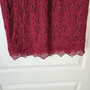 Noctflow, Dress, Women's, Large, Red, Lace, Long Sleeve, High Neck, Sheath, Holiday, Party, Evening, Formal, Elegant, Chic, Cocktail, Festive, Classic, Winter, Special Occasion, lace dress, burgundy dress, mock neck dress, long sleeve dress, cocktail dress, party dress, elegant dress, Noctflos, lace overlay, scalloped hem, evening dress, special occasion, dressy, dark red, formal, Christmas
