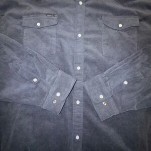 Poncho Outdoors western snap shirt crafted from a comfortable corduroy blend with a hint of stretch. This regular fit long sleeve features classic western styling with a pointed yoke and dual snap-flap chest pockets. The pearl snap closures and button-down collar provide a polished yet rugged look suitable for outdoor adventures or casual wear. Finished in a versatile dark charcoal gray, this durable shirt is designed with a slight curve to the hem for a clean untucked appearance.