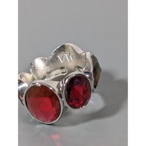 This stunning Vera Wang cocktail ring features an array of vibrant red, pink, and green cabochons. The wide stretch band ensures a comfortable fit, making it a statement piece for any occasion.