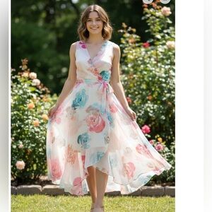 Elegant floral maxi dress featuring vibrant pink and blue accents. Perfect for any occasion.