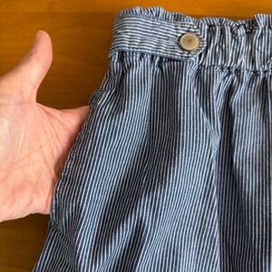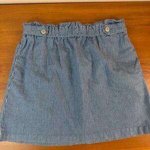 Keywords: paperbag waist, pinstripe, striped, casual skirt, denim skirt, button detail, elastic waist, summer skirt, resort wear, beach skirt, everyday wear, lightweight