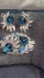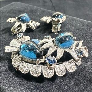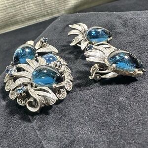 Lovely Vtg Blue Rhinestone & Cabochon Floral 3-Dimensional Brooch & Earring Set