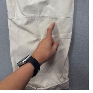 Relaxed crop pants for everyday wear, featuring a comfortable elastic drawstring waistband for an adjustable fit. The design includes a cuffed hem, adding a touch of casual style to the cropped length. These pants also offer practicality with front patch pockets and a single button-closure back pocket, blending convenience with a clean aesthetic. Great preowned condition. One minor discoloration spot as pictured.