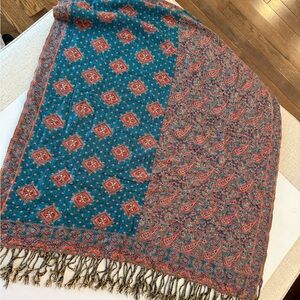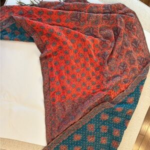 Vibrant scarf featuring paisley and geometric patterns. Rich orange and teal colors.