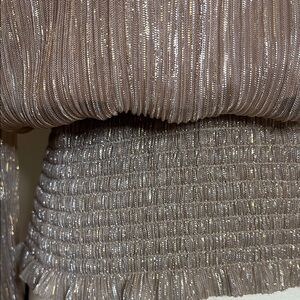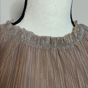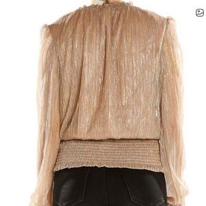 This is a Joie metallic shimmer long-sleeved smocked blouse in a champagne gold color. with silver and gold metallic threads. This particular top features a high neck, long sheer puff sleeves, and a smocked elastic waistband.