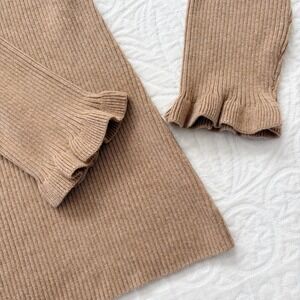 Scoop-neck tie-front ribbed jumper with long sleeves and subtle ruffle cuffs in a lightweight, slightly fitted knit—an easy, feminine layer for year‑round wear.