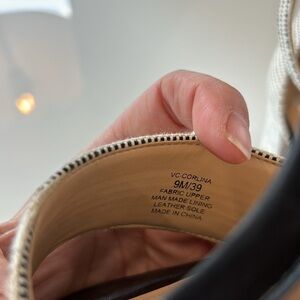 Good Condition - Vince Camuto Sandal Heels - Size 9 (39). Black and white fabric bands. The material is in excellent condition. Lots of life left in the sole. 3.25” heel.