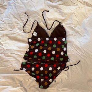 Stylish polka dot bikini set featuring vibrant colors. Perfect for a day at the beach or pool.