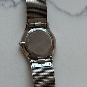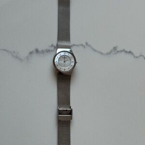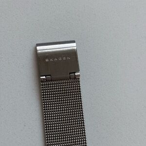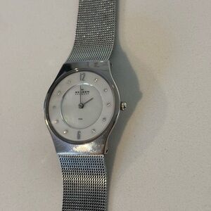 Chic Skagen watch with a silver mesh band. Features a mother of pearl dial with crystal markers. GUC and has a new battery.