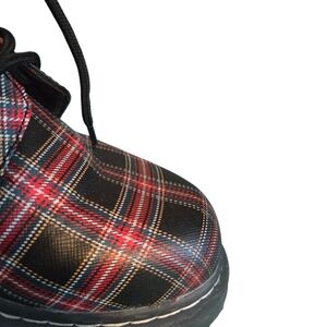 Stylish plaid lace-up combat boots. Features a bold red and black pattern. In excellent condition. Easy to clean with heel tab and sude zipper for easy on and off. Women's size 8.5