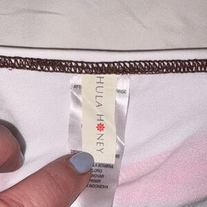 Stylish brown and pink two-piece swimsuit with tie details. Perfect for the beach or pool.