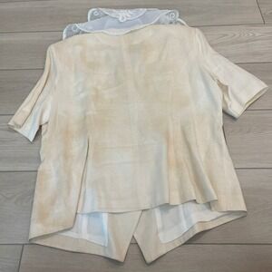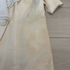 Elegant short-sleeve blazer jacket showcasing a unique vintage-inspired design. This cream-colored ramie jacket features a double-breasted style with two decorative pearl-like button closures. The most eye-catching feature is the removable, sheer white collar, intricately embroidered with floral patterns and scalloped edges, adding a touch of sophistication. The jacket is fully lined. Perfect for adding a touch of class to a professional ensemble, dressy brunch, or a special occasion.