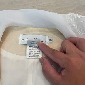 Keywords: Anne French, Blazer, Jacket, Cream, Ramie, Short Sleeve, Embellished Collar, Double Breasted, Vintage Inspired, Elegant, Professional, Special Occasion, Button Closure, Removable Collar