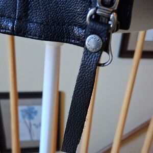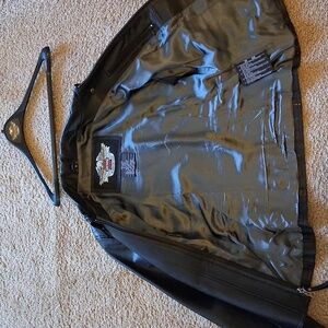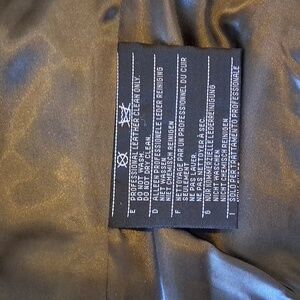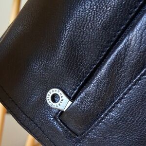 Timeless black leather jacket with sleek design. Features a tailored fit and durable material. Ideal for versatile styling. Comes with original store hanger.