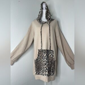 White Birch Beige Leopard Animal Print Hooded Kangaroo Pocket Sweatshirt Dress