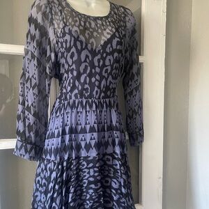 Elegant long sleeve dress with a unique pattern. Flattering tiered design. Ideal for versatile styling.