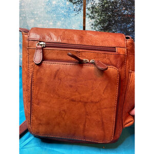 This is a pre-owned M.C. brand leather crossbody bag. The exterior is a reddish-brown color with visible creasing and some discoloration. It features a flap closure with a metal clasp, a shoulder strap, and multiple zippered compartments. The interior is lined with a brown fabric with the M.C. logo. There is a zippered pocket inside. The bag shows signs of wear consistent with its pre-owned condition.