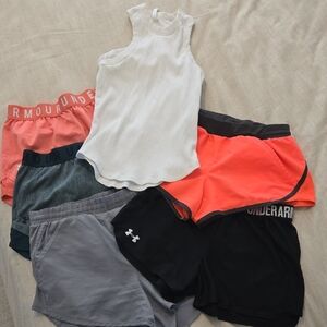 Diverse collection of Under Armour activewear. Includes 4 tank tops, 6 shorts, and 2 leggings. Perfect for workouts.