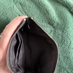 Elegant black wristlet with signature Coach pattern. Features a secure zip closure and wrist strap. Perfect for on-the-go style.
