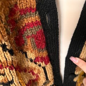 Stylish vintage black cardigan with vibrant yellow and red pattern. Perfect for a bold look.