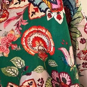 New with tags, size xl . Gorgeous colorful pattern with tie waist, elastic cuffs on sleeves and makes a beautiful pop of color over tanks, dresses , tees ect. Charming blouse with vibrant floral patterns. Features a V-neck and tassel accents. Perfect for a stylish look.