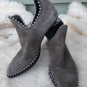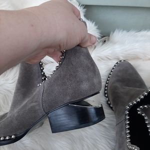 Stylish and unique gray suede ankle boots with silver stud detailing. Beautiful signature heel!