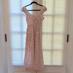 Charming floral maxi dress by Christy Dawn. Features a delicate white and pink pattern. Perfect for any occasion.
