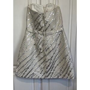 Stand out in this stunning Karlie cocktail dress! This strapless mini dress features a unique silver geometric pearl design that is sure to make you the center of attention at any party or cocktail event. The dress has a zip closure and is designed to fit women's size L in a regular fit style.