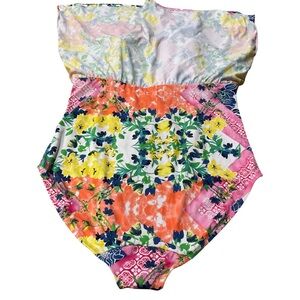 Cacique (Lane Bryant) swim dress / tankini top in women’s plus size 22. Bright floral patchwork print with pink border accents and a flowy babydoll/empire-waist silhouette that gives comfy coverage while still looking cute. Built-in lined bust area (nude lining) for support/coverage. Perfect for pool days, cruises, resort vacations, water parks, and beach trips.