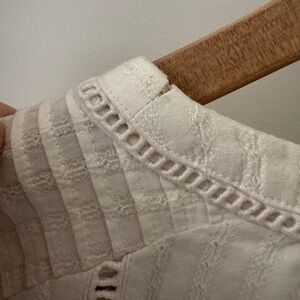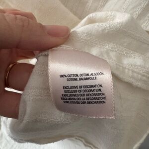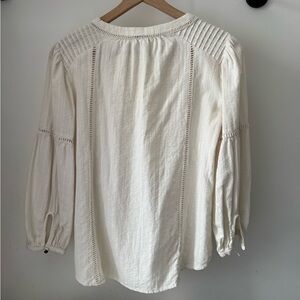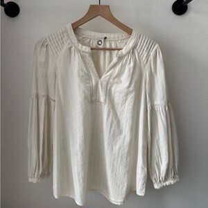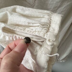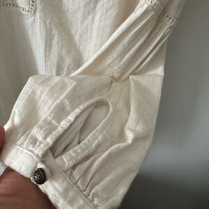 Gently worn, lightweight cotton top! Button on one sleeve came off but I still have it saved (as pictured). Some minor pulling at neck seam but in otherwise great condition.