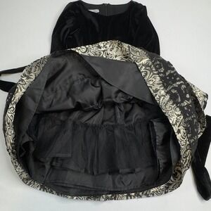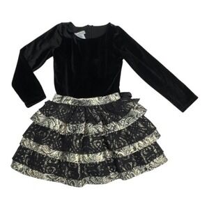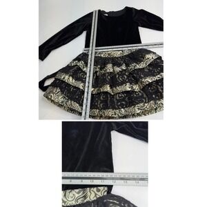 Captivating charm with a touch of playful elegance, this girls' dress is designed to turn heads. The bodice features a luxuriously soft black velvet, flowing into a tiered skirt of intricate black lace over a shimmering gold-toned fabric.