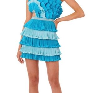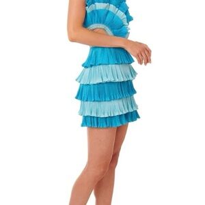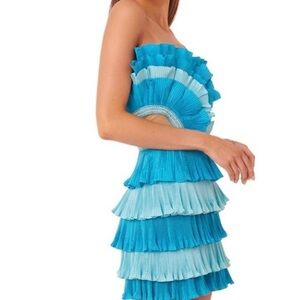 The Josephine Dress is luxuriously layered with finely pleated ruffles which curve around the body. This fitted bandeau mini is the ultimate style for your next event, with a metal zip fastening at the back and fully lined, the bold colour contrasts of cobalt and sky blue create a truly dramatic effect. This lavishly layered mini dress will make an impact in the heat of summer.