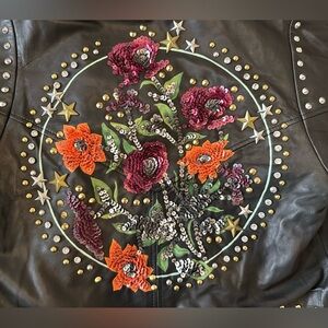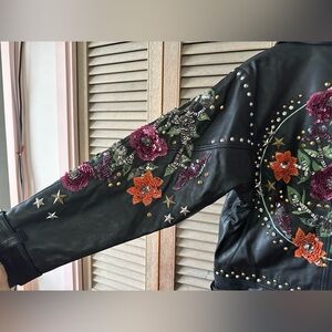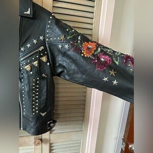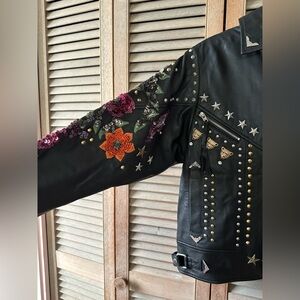Amazing super rare real leather black TOPSHOP biker bomber jacket embellished with loads of studs and sparkly sequin flowers. The details are stunning; studs include leopard/panther heads and stars. The sequin flowers feature hand painted design under the embellishments. Leather is buttery soft; jacket is fully lined. Has zipper closures, adjustable buckles/straps and pockets. Worn just once; in EUC except there is one silver embellishment missing, and some tarnished hardware (pls see pics).