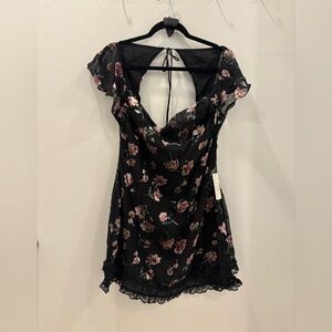 Elegant black dress with pink floral pattern. Features delicate green leaves. Perfect for any occasion.
