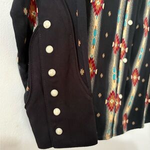 Bold western shirt with vibrant red and blue patterns. Classic Wrangler style.
