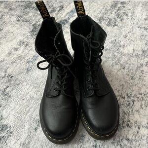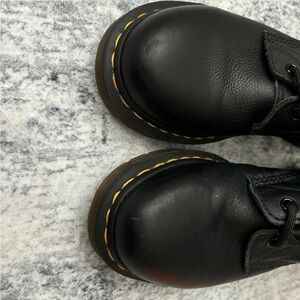 Classic black combat boots. Durable leather. Iconic yellow stitching.