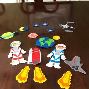 Vibrant solar system bulletin board set, double sided, featuring planets and the sun. Perfect for educational decor. The three finger puppets are included, one is an astronaut the other two are aliens. The felt people and other felt pieces are included.
