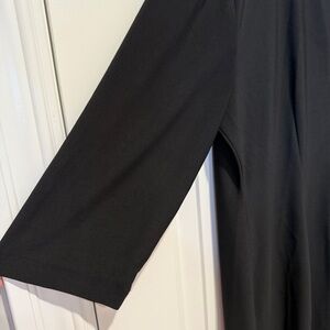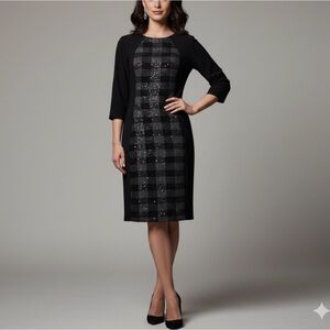 Chic black plaid midi dress with sequin accents. Features elegant design. Perfect for any occasion. 3/4 Length Sleeves.