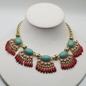 J Crew Beaded Statement Necklace Fan Colorful Multicolor Gold Tone Fringe Dangle