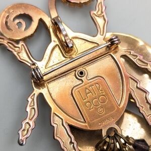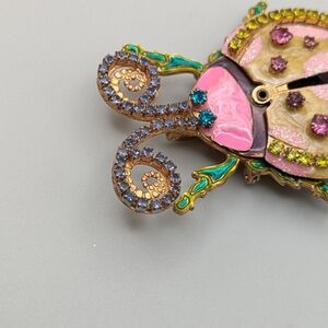 Flitter and glitter. Pastel-colored epoxy enamel accents; prong-set, round crystals; diamond-shaped, faceted crystals; and corrugated goldtone beads give this ladybug pin its sparkle. Moveable wings add a flutter of fancy. From the Lunch at the Ritz 2 Go Collection.