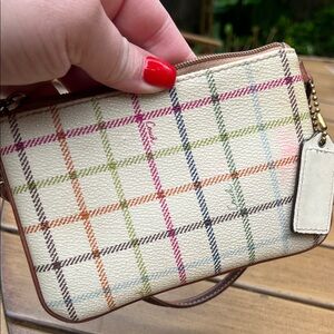 Chic Coach wristlet with a vibrant plaid pattern. Features a striking blue stripe and elegant brown accents. Ideal for essentials. Used and with stains and marks just needs some clean up and authentic.