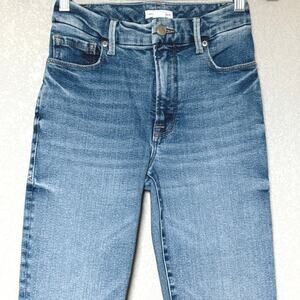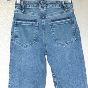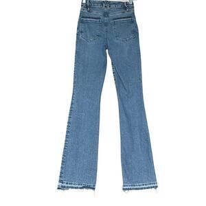 Stylish flare jeans. Classic blue denim. Frayed hem detail.