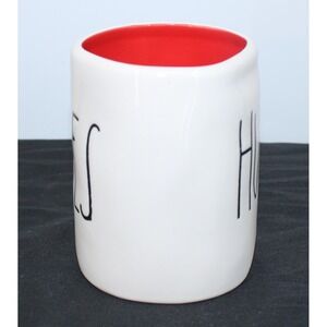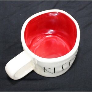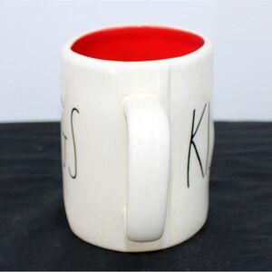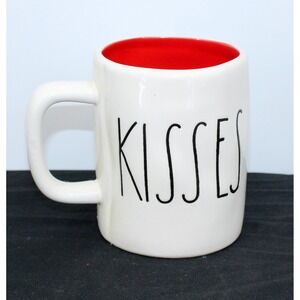 Rae Dunn Artisan Collection ceramic mug by Magenta features the iconic elongated "HUGS" and "KISSES" text on opposite sides. This charming piece showcases a creamy white exterior with a vibrant red interior, perfect for adding a pop of color to your kitchen. Crafted with the signature handcrafted, slightly irregular look that collectors love, it includes a sturdy handle for a comfortable grip. Dishwasher safe and microwave safe (may get hot), this mug is a delightful addition to any farmhouse-style decor or Rae Dunn collection.