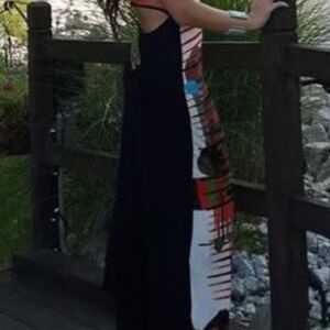 Vibrant dress with a unique graphic print. Features a mix of colors for a bold look.