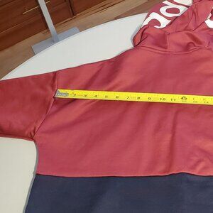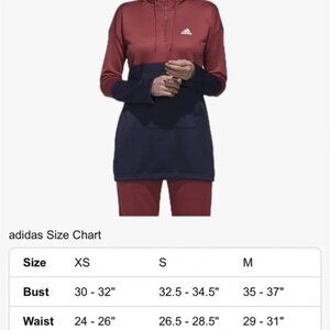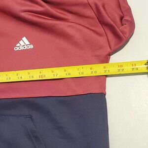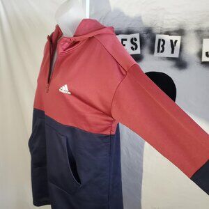 Navy blue and burgundy hoodie with quarter zip in front and has "ADIDAS' in white on hood and logo on front - 53cotton/47poly and the fabric does have a sheen to it - marked on tag '06/20' and I bought this from Adidas outlet - in excellent used condition - hood drawstring has pulled out (will include in case you want to put it back) - front kangaroo pocket - nice that it is longer at 29.5 inches - P2P is 21 inches - S2S is 21 inches as well as sleeve length (all in photos) - first 3 pics from Adidas site, rest are actual hoodie