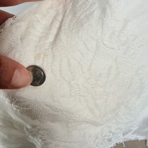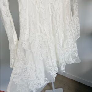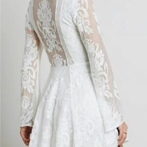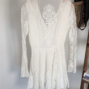 Romantic off-white lace dress featuring a deep V-neckline, sheer embroidered bell sleeves, and a softly flared skirt. The bodice is lined for coverage while the sleeves and back remain sheer, making this a beautiful statement piece for festivals, events, or special occasions.