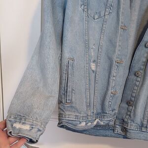 Stylish light blue denim jacket. Distressed accents for a modern look. Button front and chest pockets. The back has a custom painted phrase on it in purple and black. I think it was inspired by Olivia Rodrigo.
