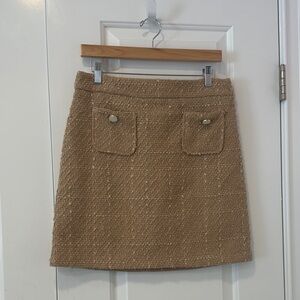 Upgrade your wardrobe with this stylish tan tweed mini skirt. Perfect for versatile styling, it adds a chic touch to any outfit.