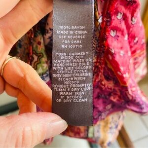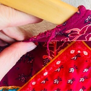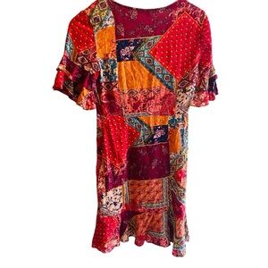 Patchwork fit and flare v neck dress . Good preowned condition with some fraying at shoulder hem as shown. Size 4 measures shoulder to hem 34”, armpit to armpit 17”, waist 13”